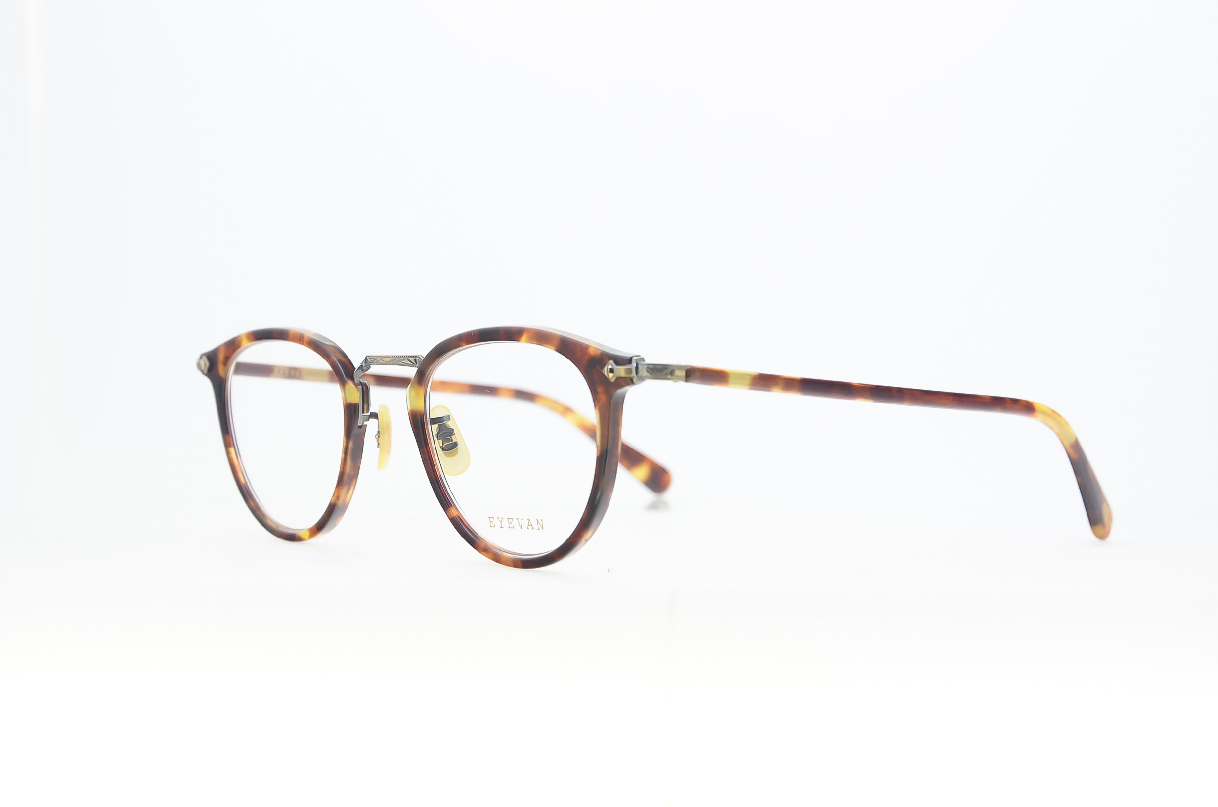 EYEVANのアイコンとなったE-500番台シリーズのE-0511につづくコンビネーションフレーム。ブリッジにはクリングス一体型のアーチバックブリッジ、テンプルは芯にβチタンを用いることによりかけ心地にも配慮した長モダンタイプ。フロントは、30年代のアメリカンヴィンテージの上リムがややフラットなパントシェイプをEYEVANらしいデザインに仕上げた。