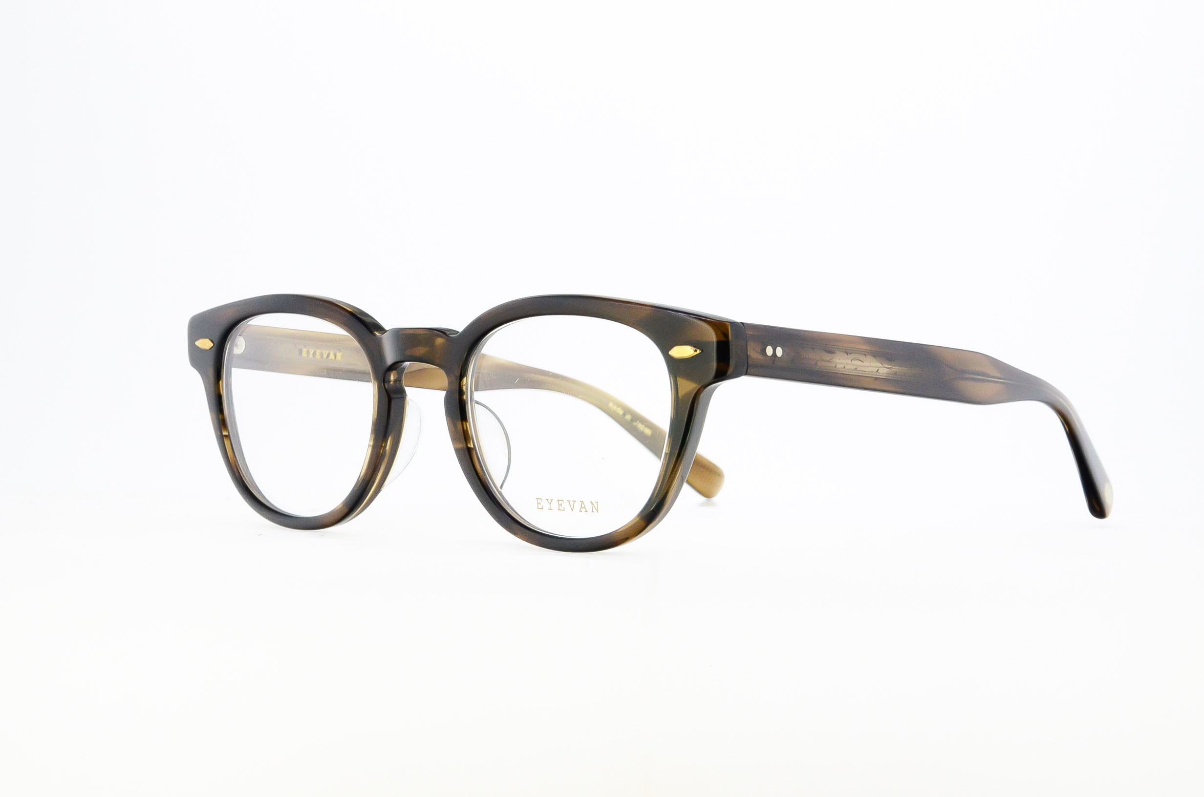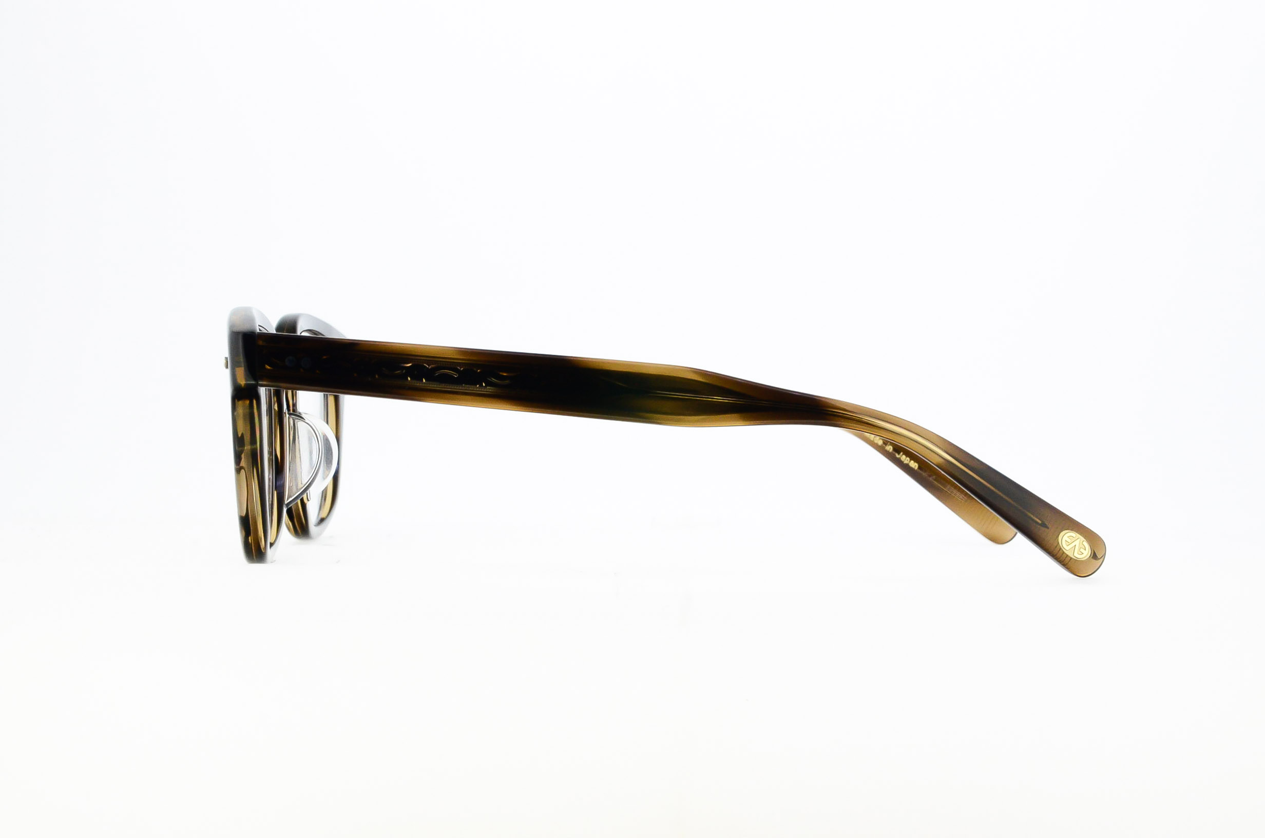 ボストンウェリントンフロントに、オリジナルのカシメ飾り丁番を採用したプラスチックフレーム。 テンプル芯には、クラシックカーのパーツからインスパイアされた柄を表裏に彫り込んだオリジナル芯を採用。