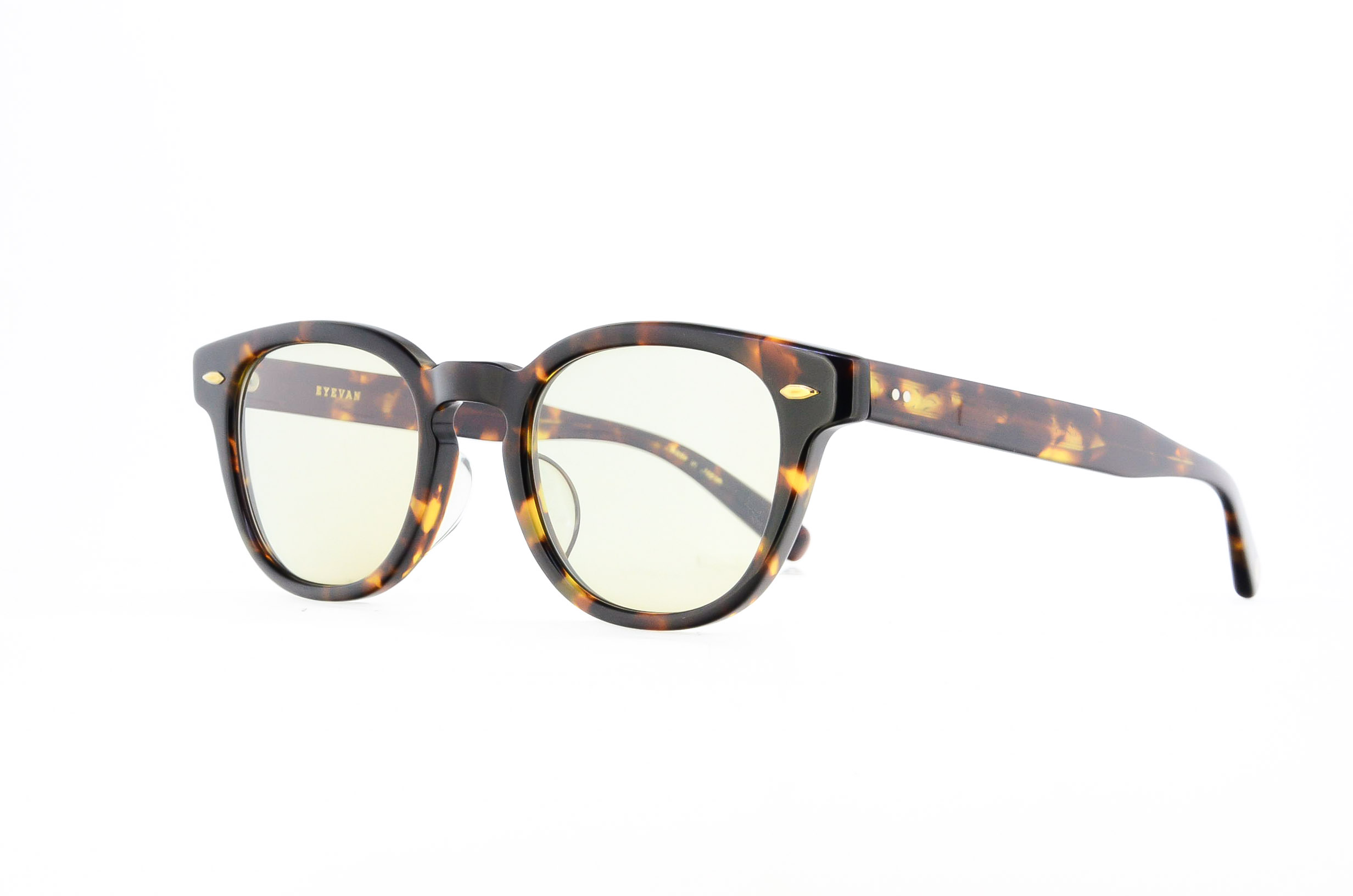 ボストンウェリントンフロントに、オリジナルのカシメ飾り丁番を採用したプラスチックフレーム。 テンプル芯には、クラシックカーのパーツからインスパイアされた柄を表裏に彫り込んだオリジナル芯を採用。