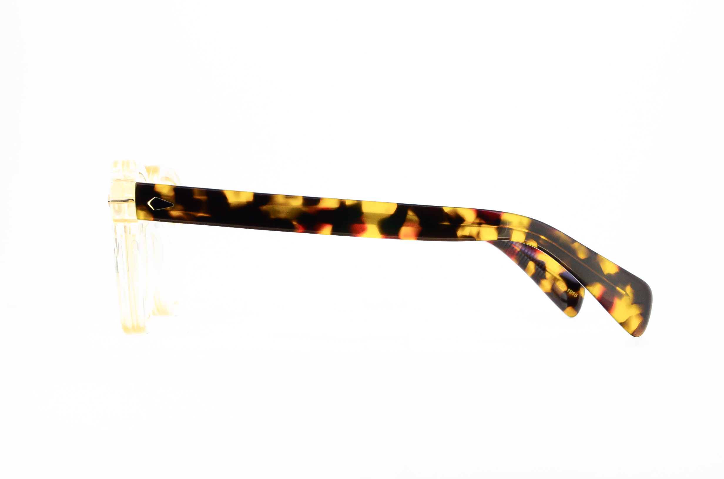 厚さ8mmのイタリアンアセテートを贅沢に使ったスクエアフォルムに、ダイヤモンド型のリベットとキーホールブリッジを組み合わせた遊び心のあるデザイン。パドルテンプルにはブランド刻印、滑らかな7バレルヒンジを内蔵しており、見た目の存在感と快適な装着感を両立しています。