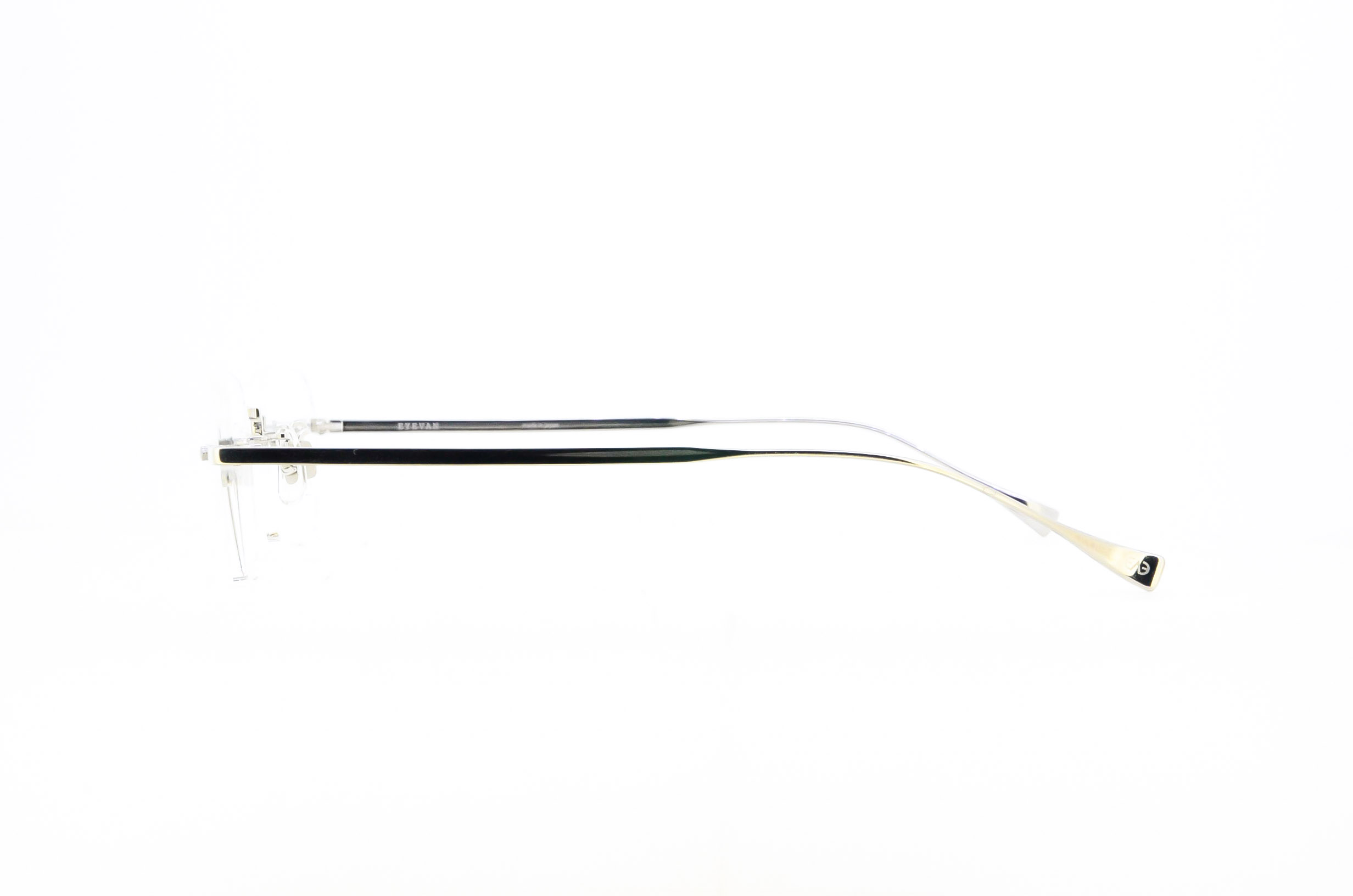 直線的なヨロイ形状が特徴のこのモデルは、1990年代のラグジュアリーブランドが着想源となったリムレスフレーム。上から見た丁番部の曲線をできるだけ最小限に抑える ため、0.1mm単位で開閉の設計を何度も行い、チタンブロックをプレスと複雑な削り出し によって製作。特徴的なレンズシェイプは90年代のHIP HOPアーティストをイメージしたレクタングルシェイプを合わせた。すべてのパーツから装飾を排除したミニマルで最小限のデザインながら、テンプルの素材にはチタンを採用し、フィッティングにも拘った。