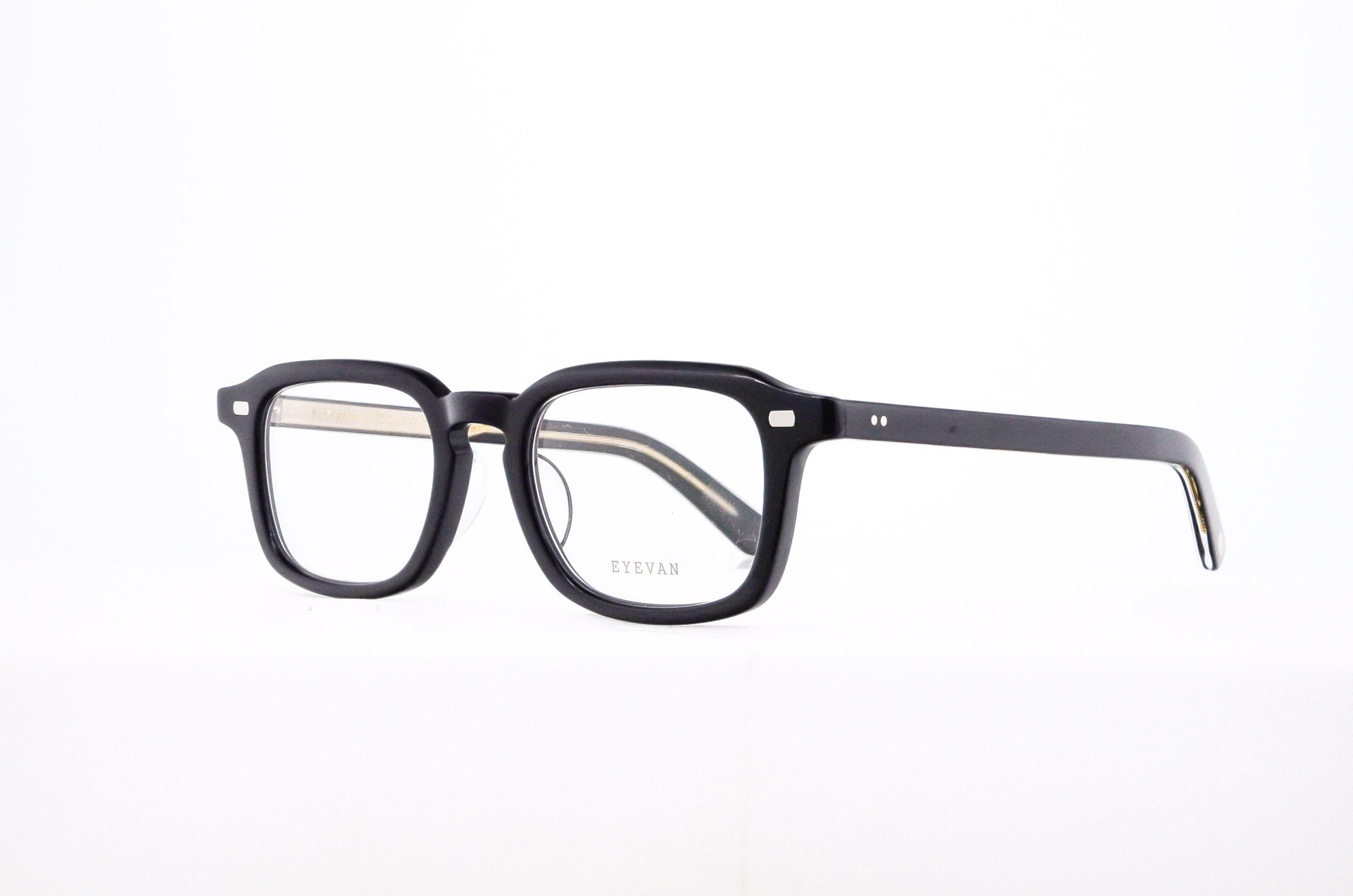Lower East Sideのリヴィントンストリートに隣接するBeastie Boys Square付近で出会った、サングラスをかけた男性の姿から着想を得たモデル。横長のフロントシェイプに、ブリティッシュヴィンテージに見られるレクタングル型の要素をミックス。ヨロイにはサンプラチナ製の飾り丁番を合わせ、シンプルにまとめた。クラシックなフォルムにストリートの空気感を掛け合わせる、EYEVANが繰り返し用いてきたデザインアプローチのひとつ。