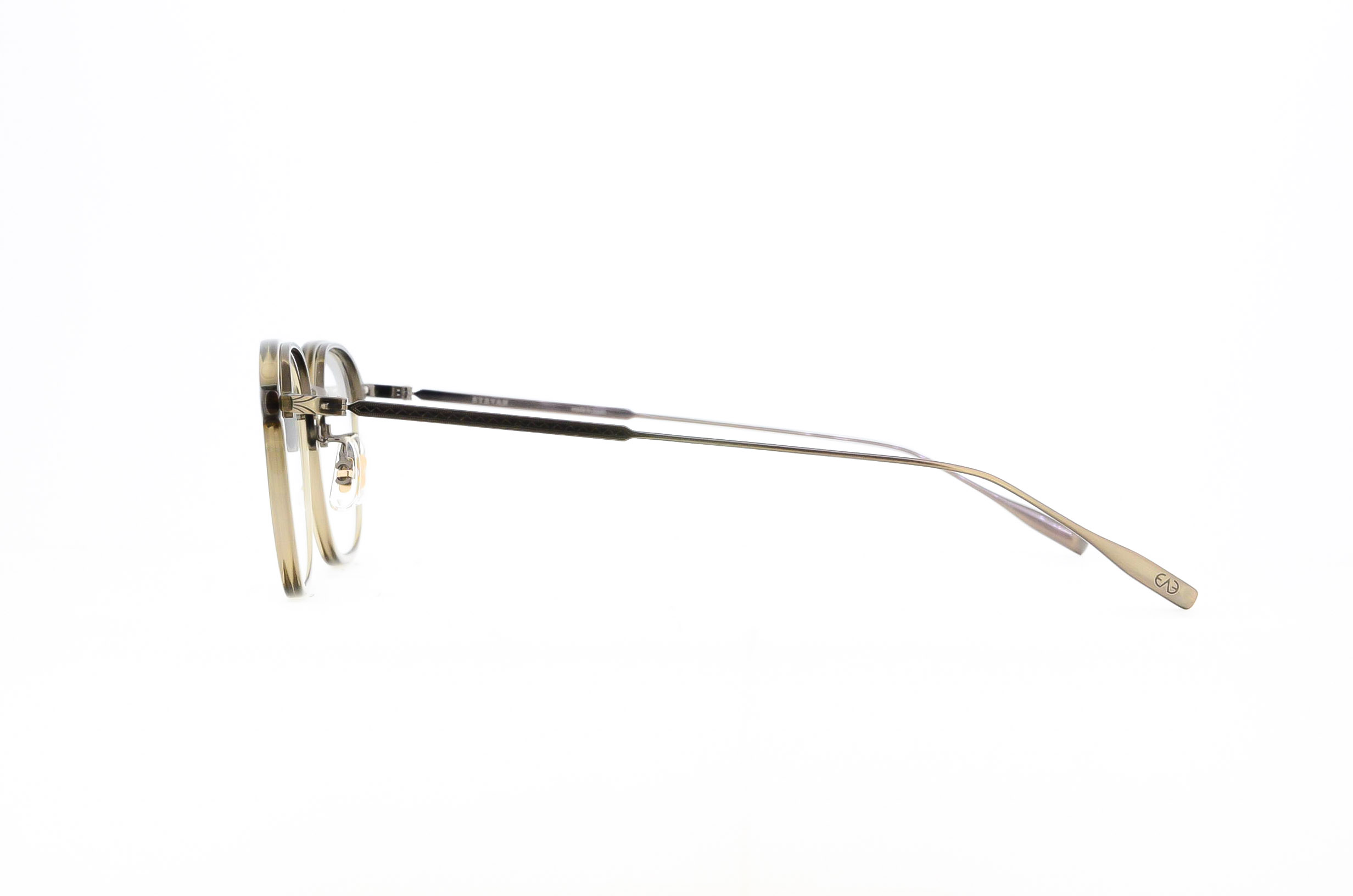 2023SSシーズンモデル『Danforth』のサイズアップバージョン。ウェリントン型のプラスチックリムに、熟練の職人技によってロウ付けを行わずに成形された、ミル模様入りの一体型トップバーを組み合わせた構造が特徴。パーツごとに分かれているかのような視覚効果を、プレス加工のみで実現している。ブリッジデザインは1930年代のスリーピースフレームを引用し、フロントからサイドにかけては、1960年代アメリカで流行した“スピードライン”と呼ばれる線状装飾を施すことで、異なる時代のヴィンテージが持つ空気感を、EYEVANの視点でひとつのプロダクトへとまとめ上げた。