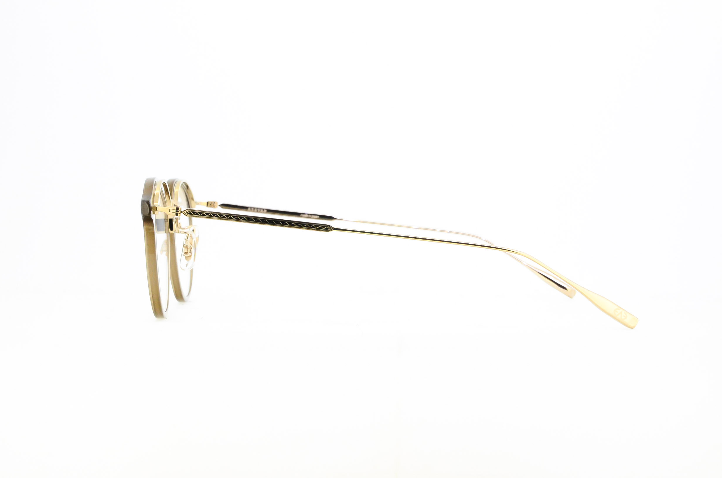 熟練の職人によって、ロー付けを行わずプレスでミル模様を鮮明に入れながら別々のパーツの様に見せた一体型トップバーに、プラスチックのリムを合わせたコンビネーションフレーム。