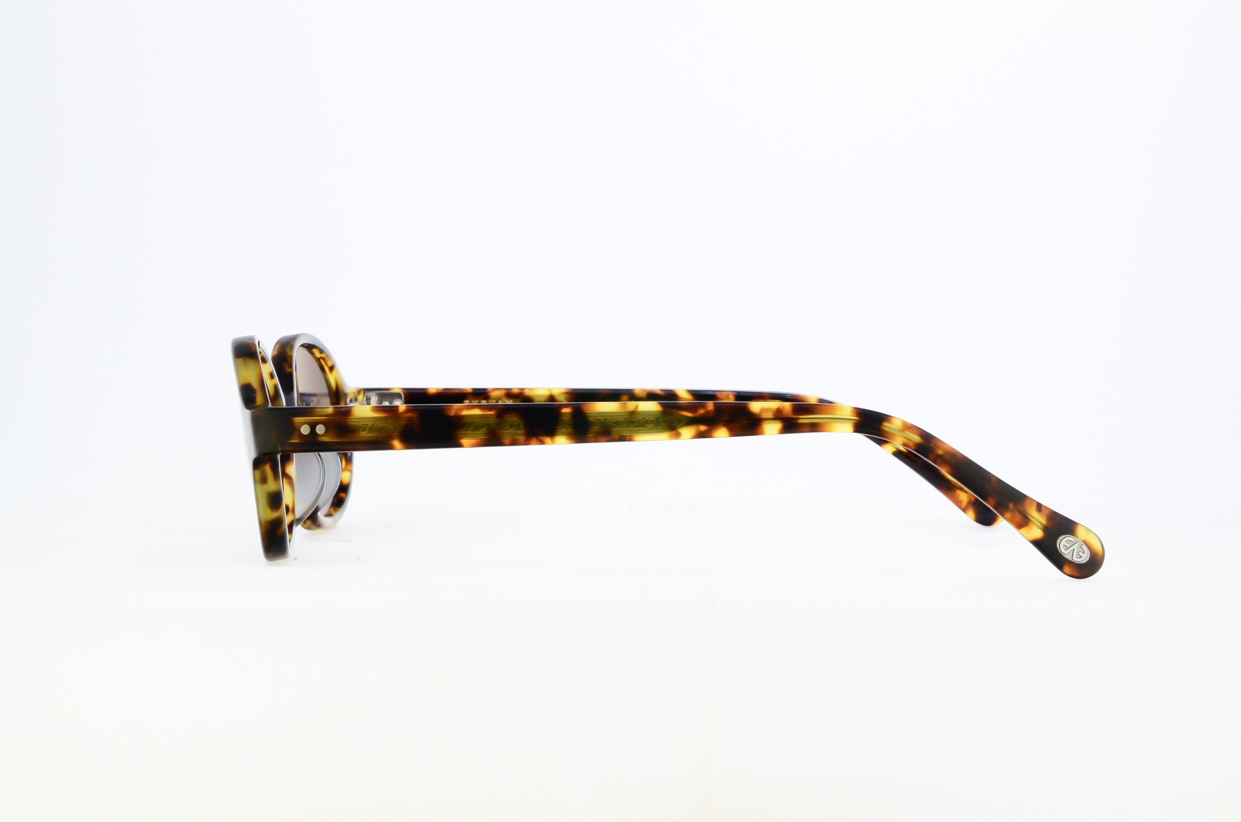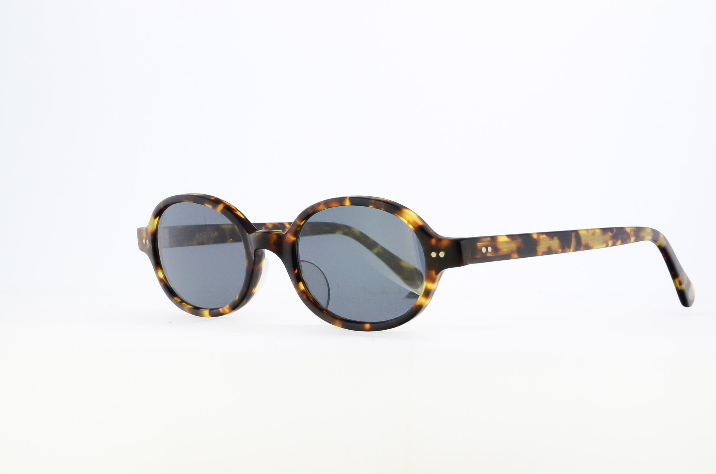 特徴的な前傾ブリッジと、リムとの絶妙なバランスで成り立つ幅広のヨロイを備えたこのモデルは、デザインチームが2000年代初頭から所有していたヴィンテージフレームを着想源としている。レンズシェイプは、初代デザインチームが残した1972年のカタログ「FRAMES」に掲載されたメタルフレームからサンプリング。全体のプロポーションを丁寧に整えることで、クラシックなムードを宿しながらも、現代のプロダクトとして再構築された、EYEVANらしい一本となった。サングラスレンズはオリジナルのCR39製、4カーブレンズを採用。