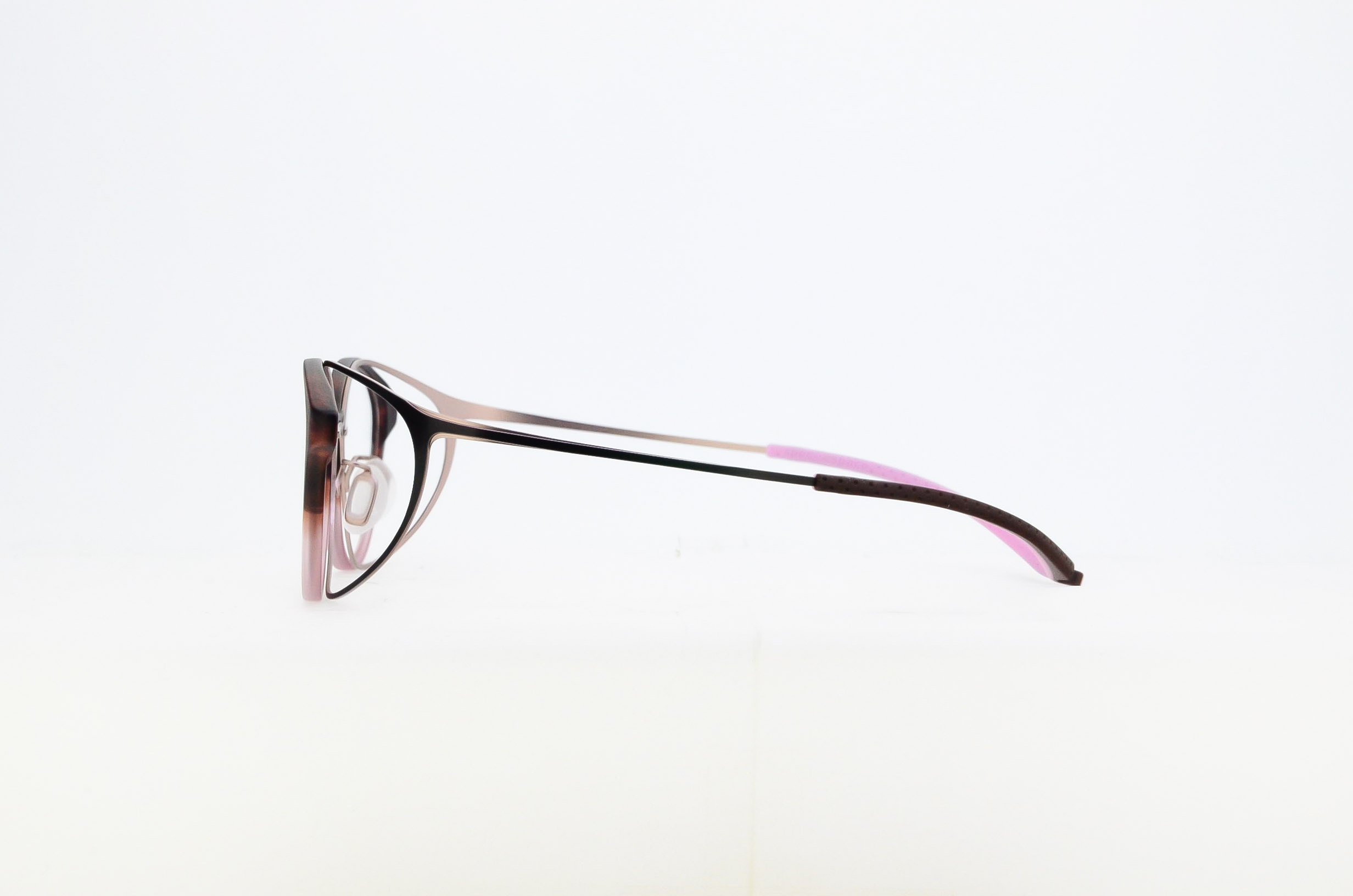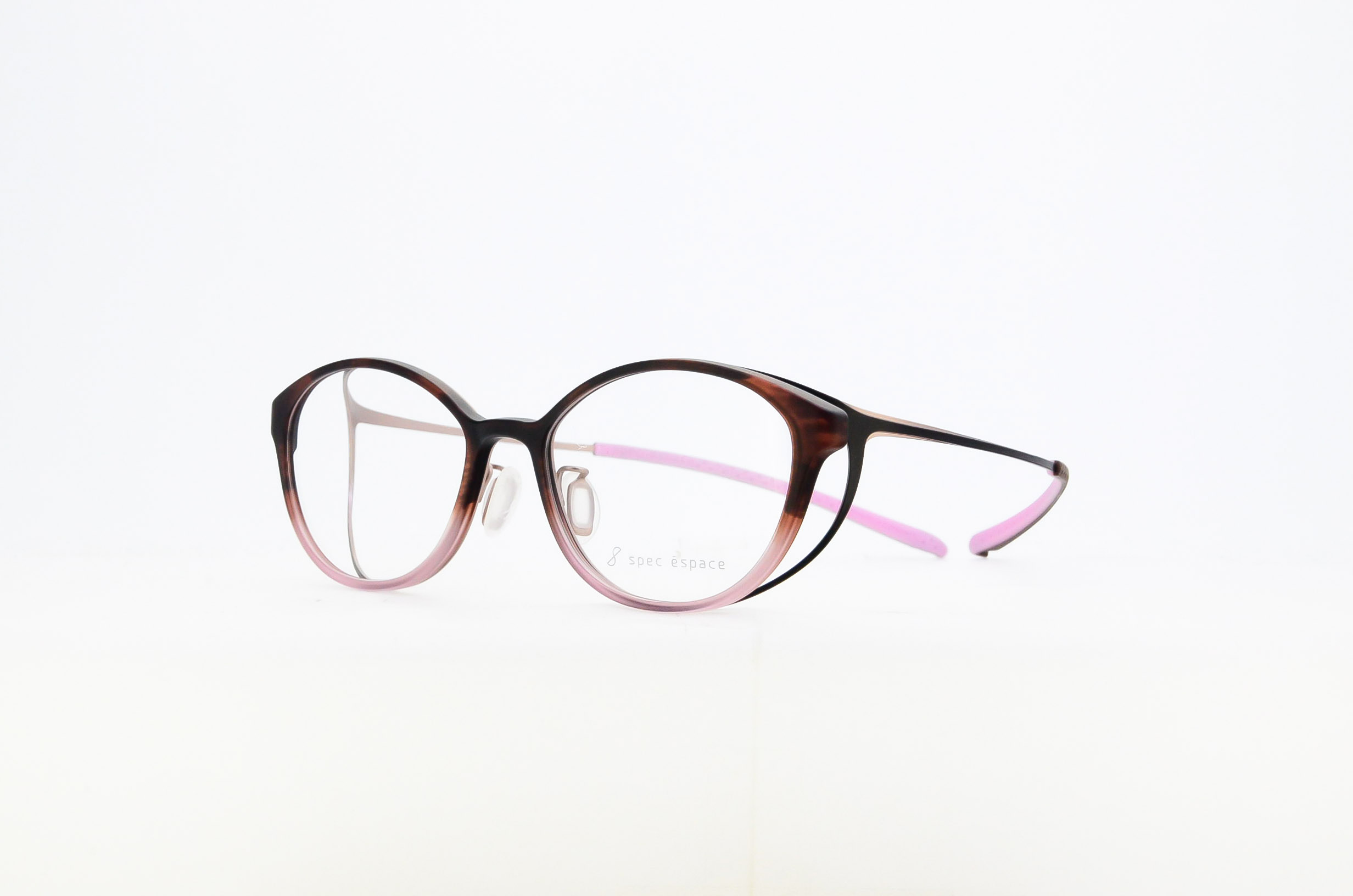 丈夫で軽やかな特殊ナイロン樹脂とβチタンを組み合わせたコンビネーションフレーム。2色のグラデーションのアセテートを使った、やや大きめのボストンシェイプは、さりげない個性と知的な印象を与える眼鏡です。