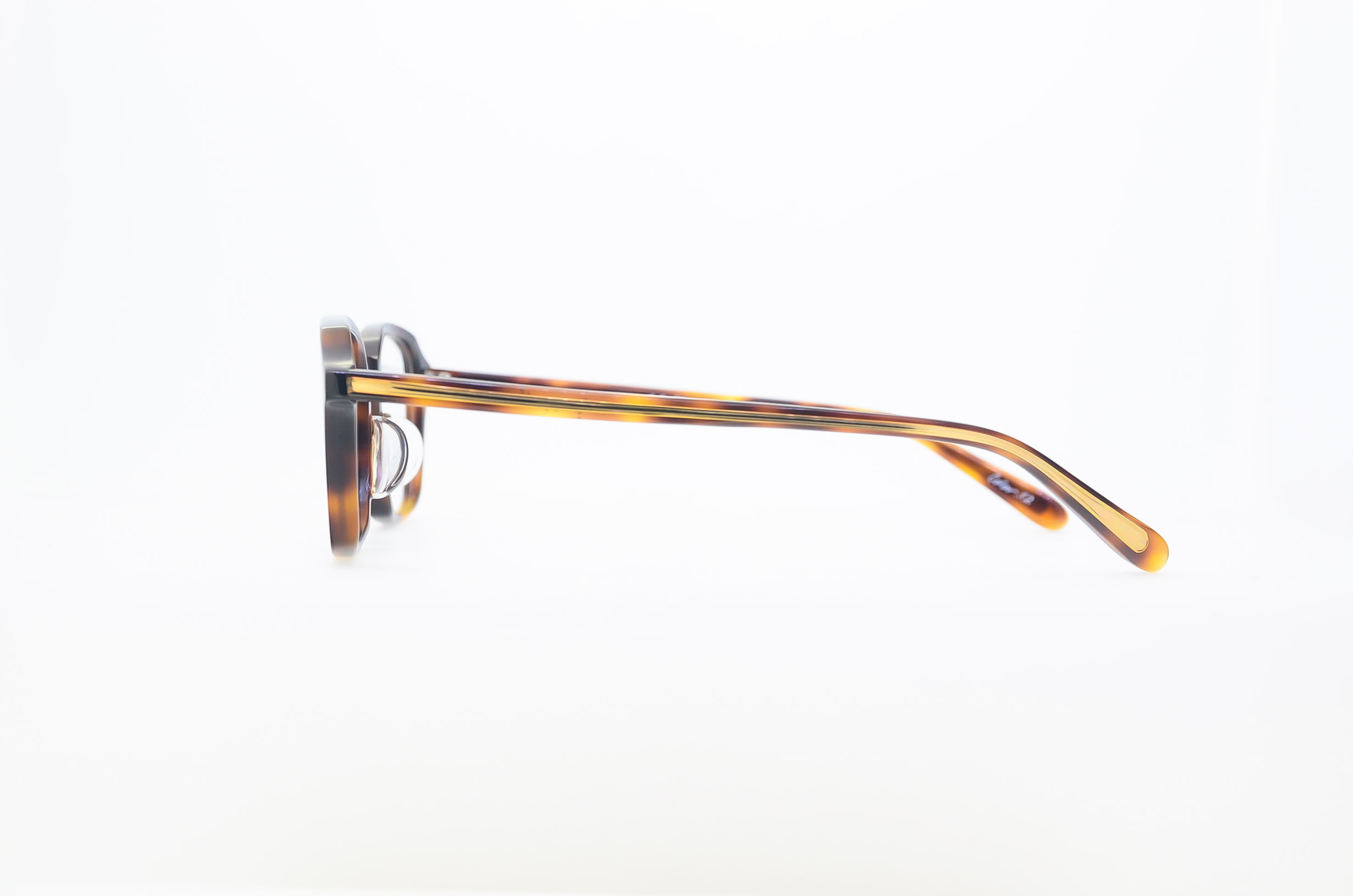 元来、装飾のために用いられることの多かった張り合わせテンプルを機構のために用い、ハンガーの構造に着目し新型テンプルを開発しました。テンプルエンドに向けて太くなる雫のように模られた芯金は、掛ける人の後頭部にウエイトを持たせることで前に落ちにくくなっています。また、テンプルの前側をくの字型にすることで逆反りを防ぎ、側頭部を包み込むような掛け心地になりました。