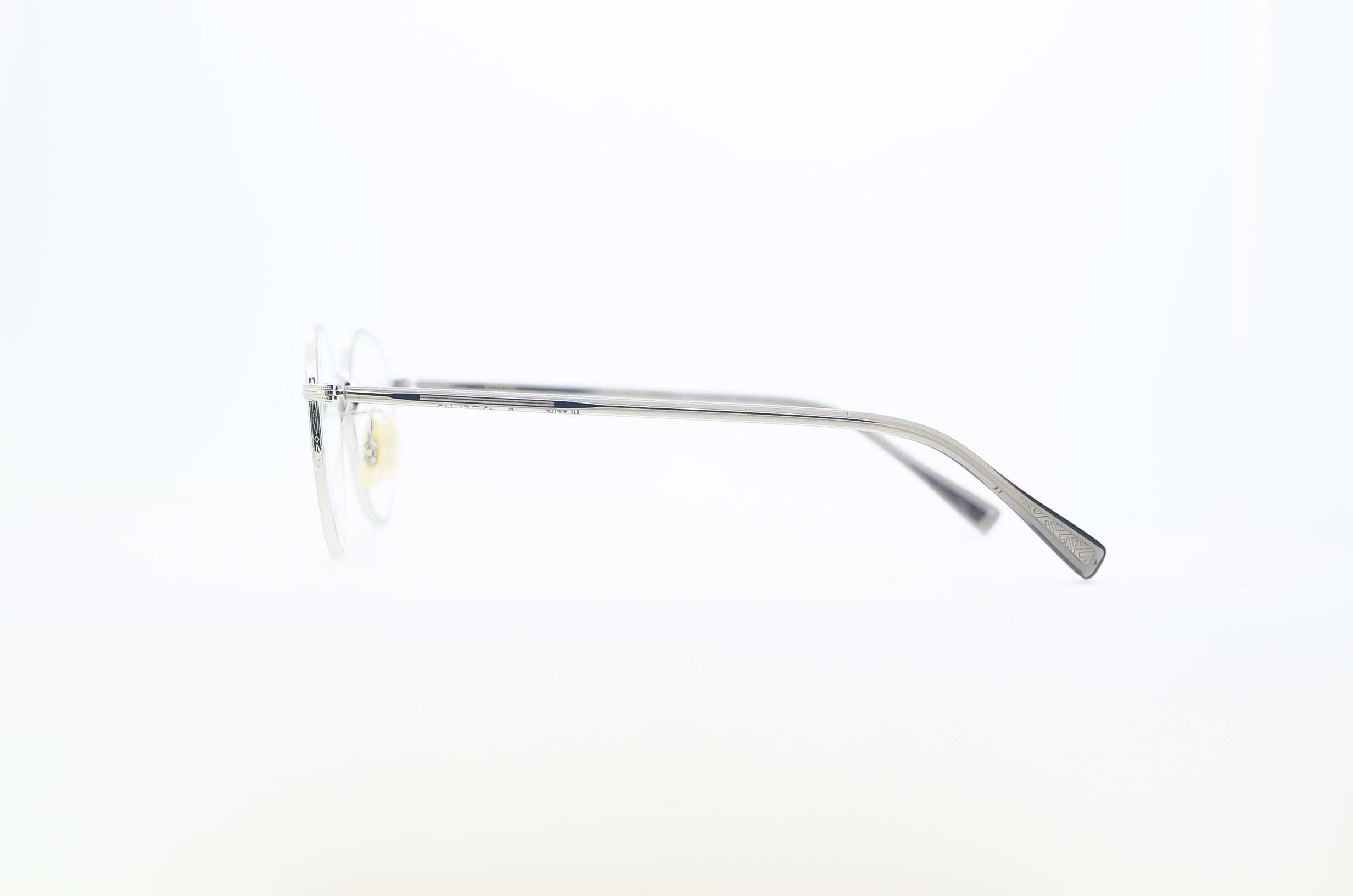 今では数少ない鯖江の職人による、芯張りの手法を用いたテンプルにタイムレスなデザインとなる様考えられたボストンシェイプのメタルフロントを合わせたフレーム。新たに型から起こしたテンプル芯のしのみには鯖江唯一の職人の手彫りによる日本古来から用いられる紗綾形文様をあしらい、あえて外側に見えるようにアセテートを組み合わせた。