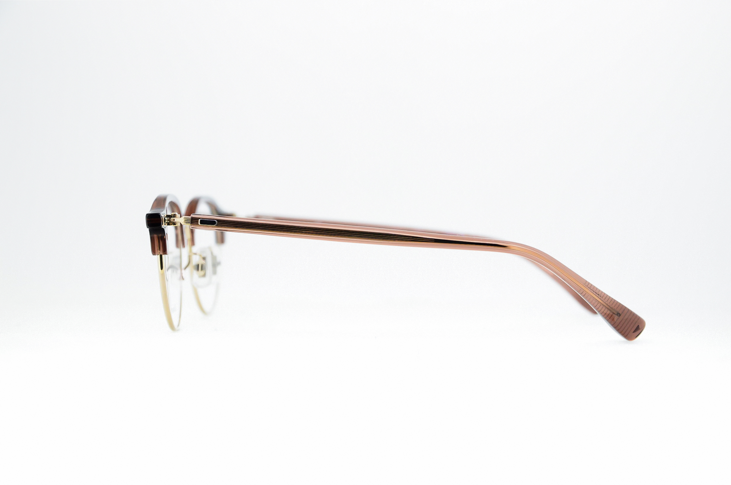 p10のレンズシェイプを採用したサーモントフレーム。 フロントは高密度で変形が少なく、人体からの影響、経年変化がしにくい特殊なプラスチックであるHighcount acetate を使用し、軽量かつ強度のあるチタン製のリム、ブリッジで組み上げた。 L字型の特殊な形状を有したテンプルは掛け心地の良さとオプティシャンによる調整のしやすさという目的を追求した結果、生まれた形状。 アセテート長モダンも玉型と同様にp10タイプを用い適正な重量と側頭部へ接する面積を考慮した。 掛け心地が良く、軽く、適正な強度があるという理想的なプロダクトを追求した。