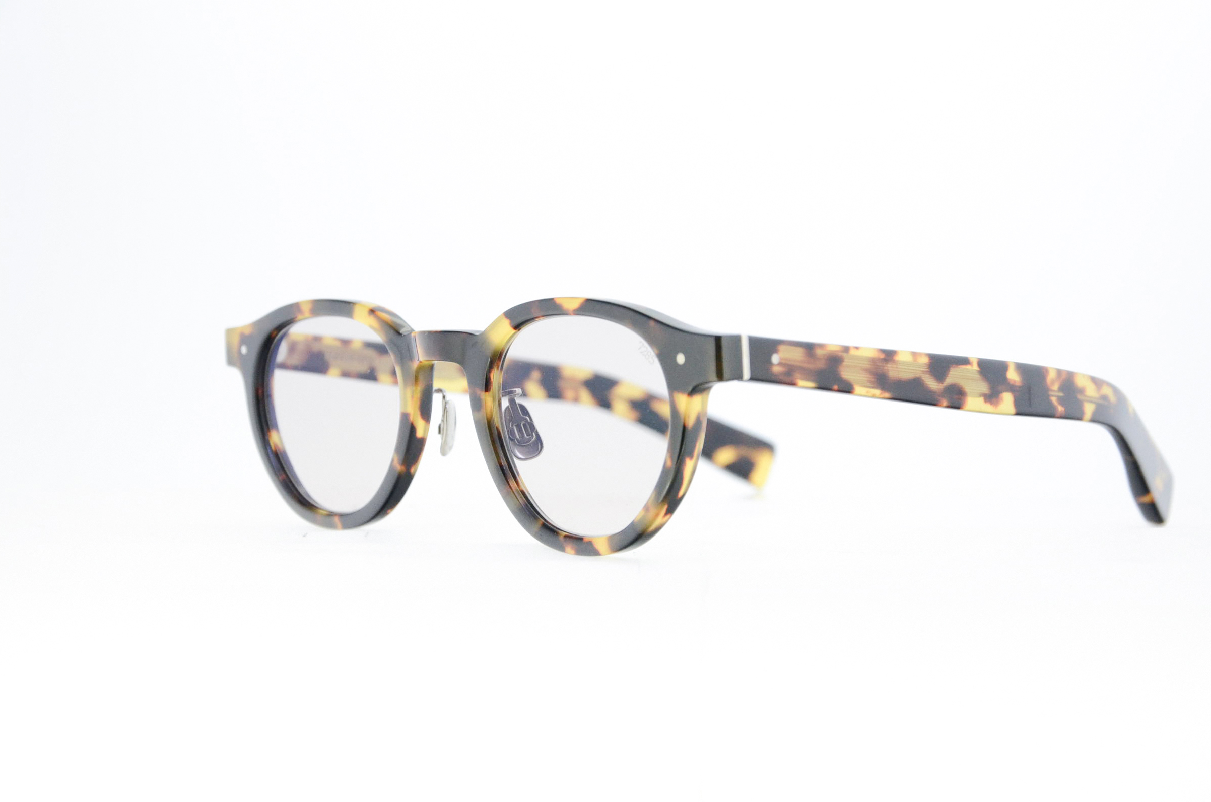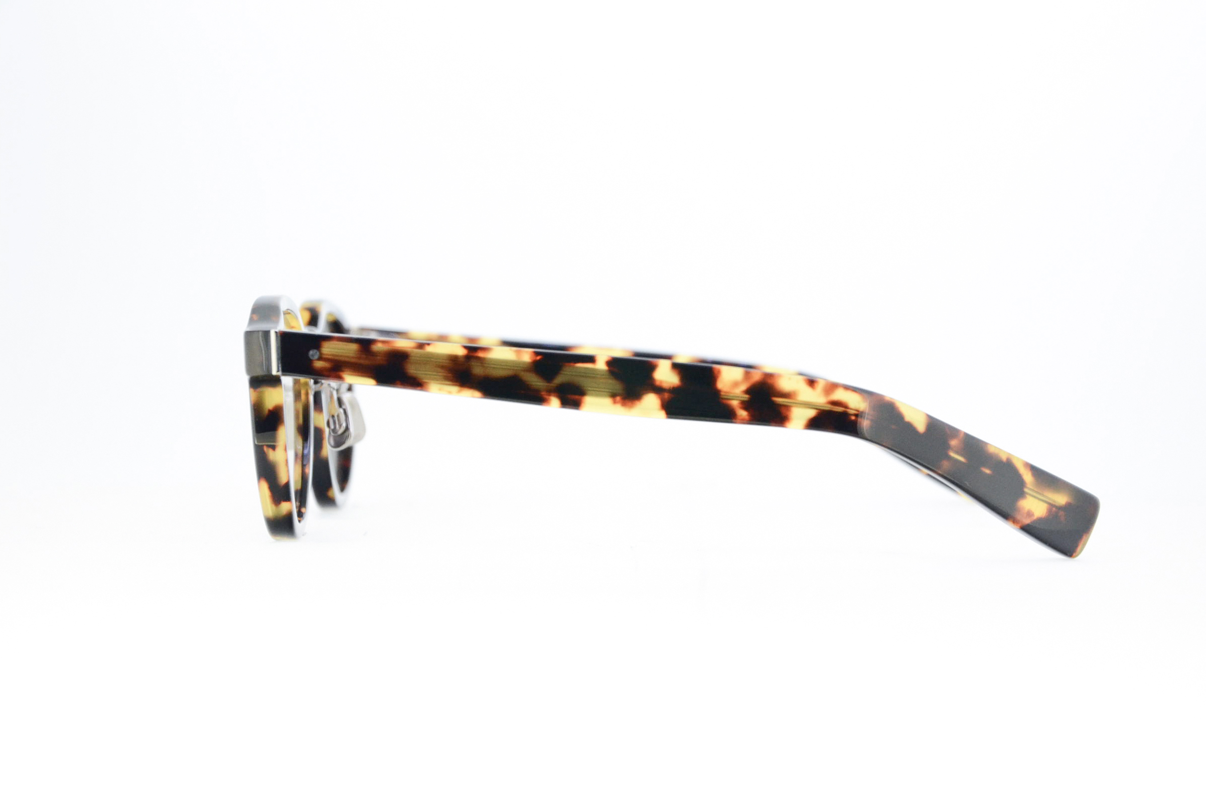 1stコレクションから様々なバリエーションを製作してきた7285のアイコンとも言える1PINカシメの新構造。本コレクションでは合口部メタルの1PINカシメ丁番を新たに開発した。プラスチックフロント、テンプルをメタル丁番と一緒に磨き上げ、合口を綺麗に合わせたあとで丁番を低温メッキするという伝統的かつレアな技法を用いた。複雑な線で構成された玉型はメタルフレーム「188」のタイプ。 オリジナリティのあるシェイプだが、セルフレームに用いると更に新鮮なルックに。全体像はミニマルかつ少し骨太な印象に仕上がった。サングラスは色味の調合を金属の粒子などを混ぜ合わせて調色し、溶解後に一枚ずつ成形して製作するガラス製オリジナルの「アイヴァンカーブレンズ」を採用。