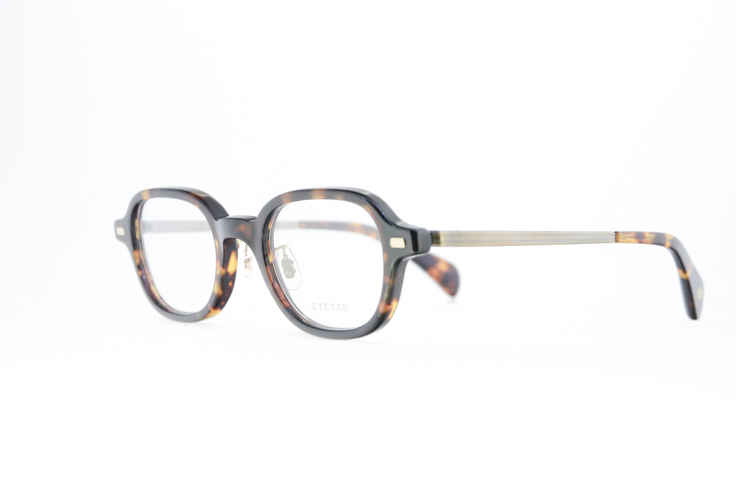 23SSコレクションでリリースされた‘‘サイドマウントスタイル”が特徴的な 『Ramsey』から派生したコンビネ ーションモデル。フレンチヴィンテージからサンプリングされたフロントデザインを0.1mm単位で調整し細リムスタイルにリデザイン。ヨロイにはEYEVANのアイコン的なディティールである1PIN、1SCREWパーツを採用し、βチタンテンプルにはヴィンテージからサンプリングしたモダンを合わせた。