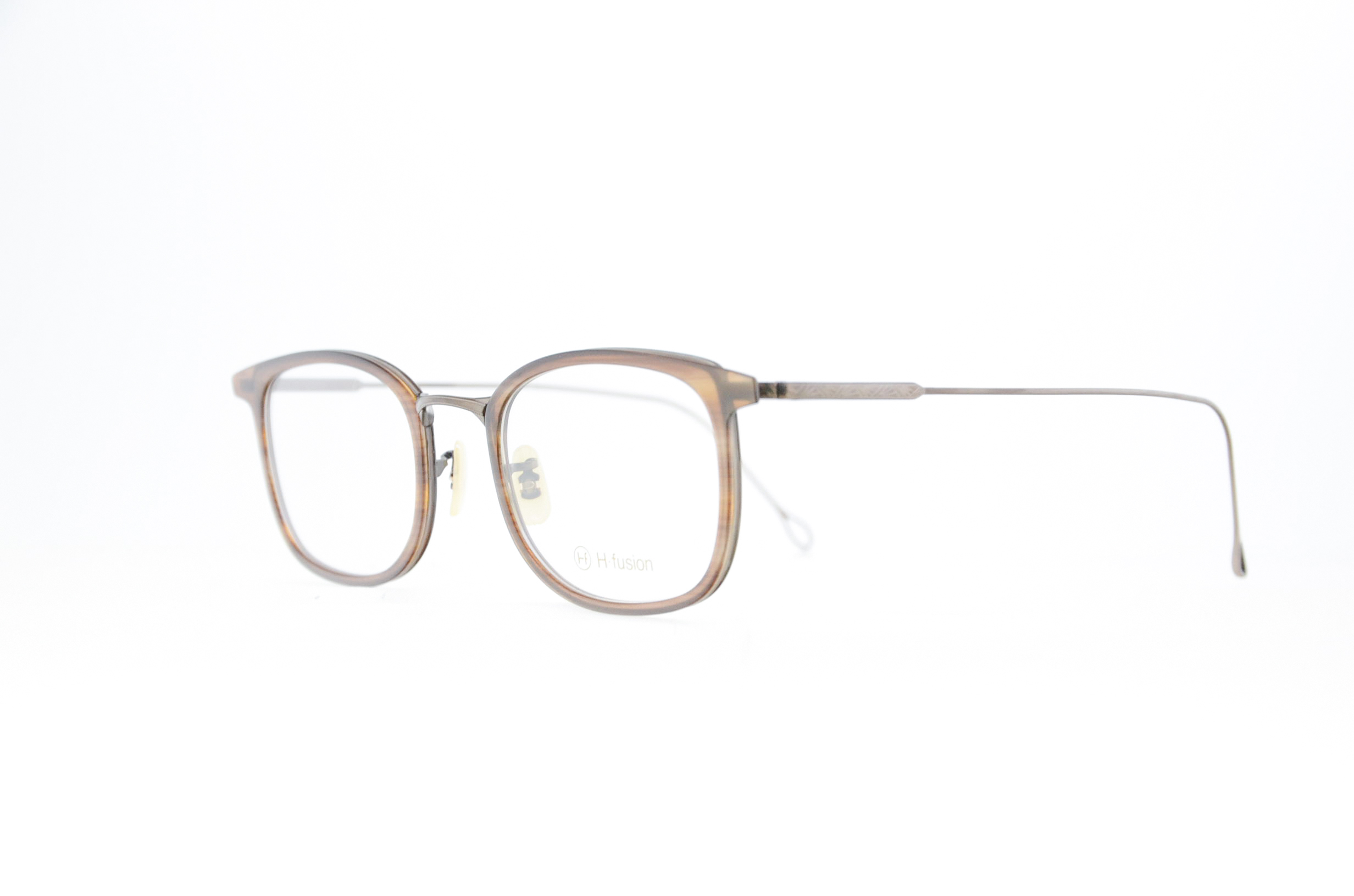 サングラスとしても活躍しそうなビッグシェイプのスクエア型コンビネーションフレーム。アセテートリムのインナーから輝くメタルパーツやフレームを彩る細やかな彫金、繊細なラインなど、すべてにおいて上質でクラシカルなデザインを追求しました。