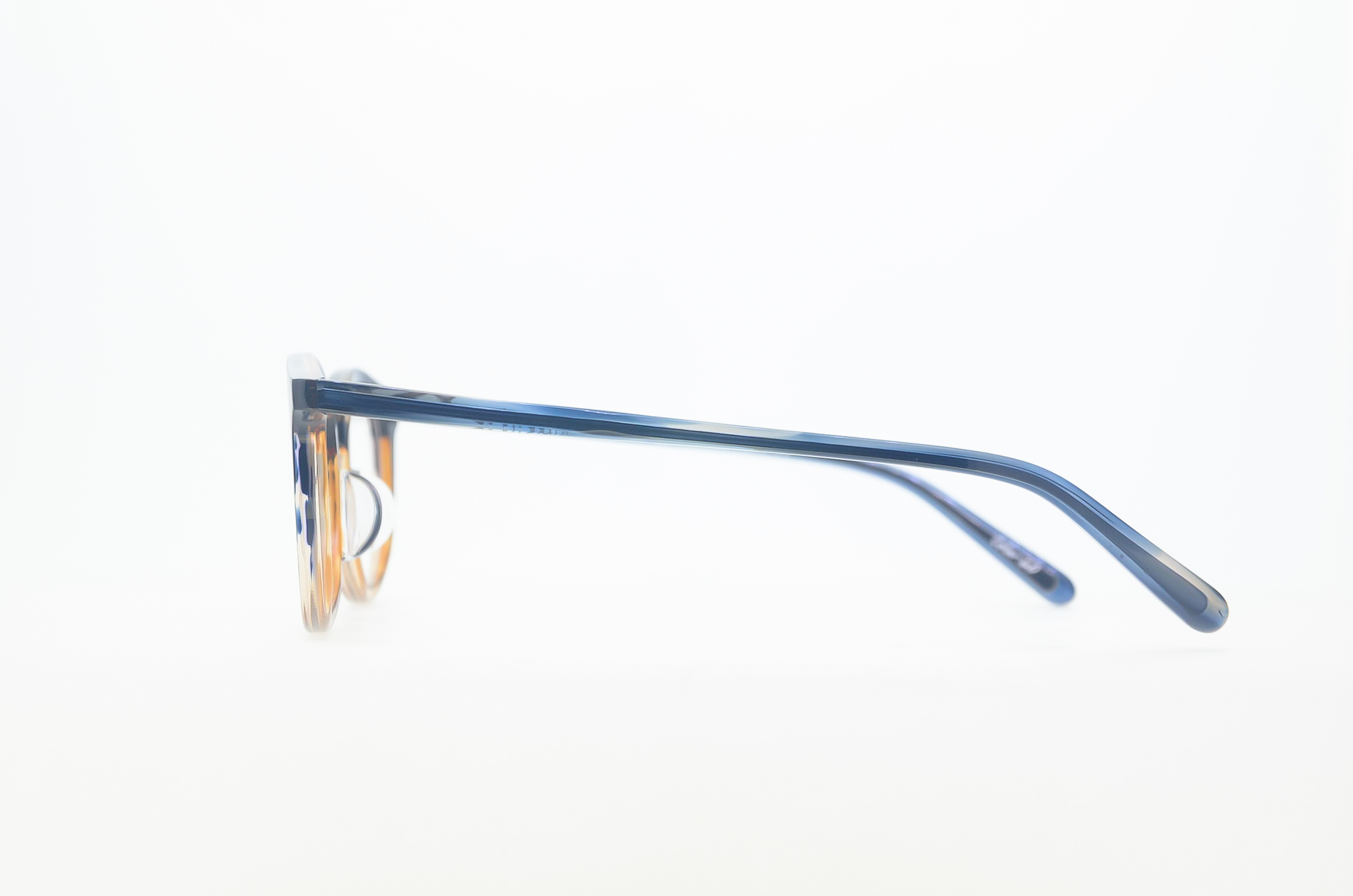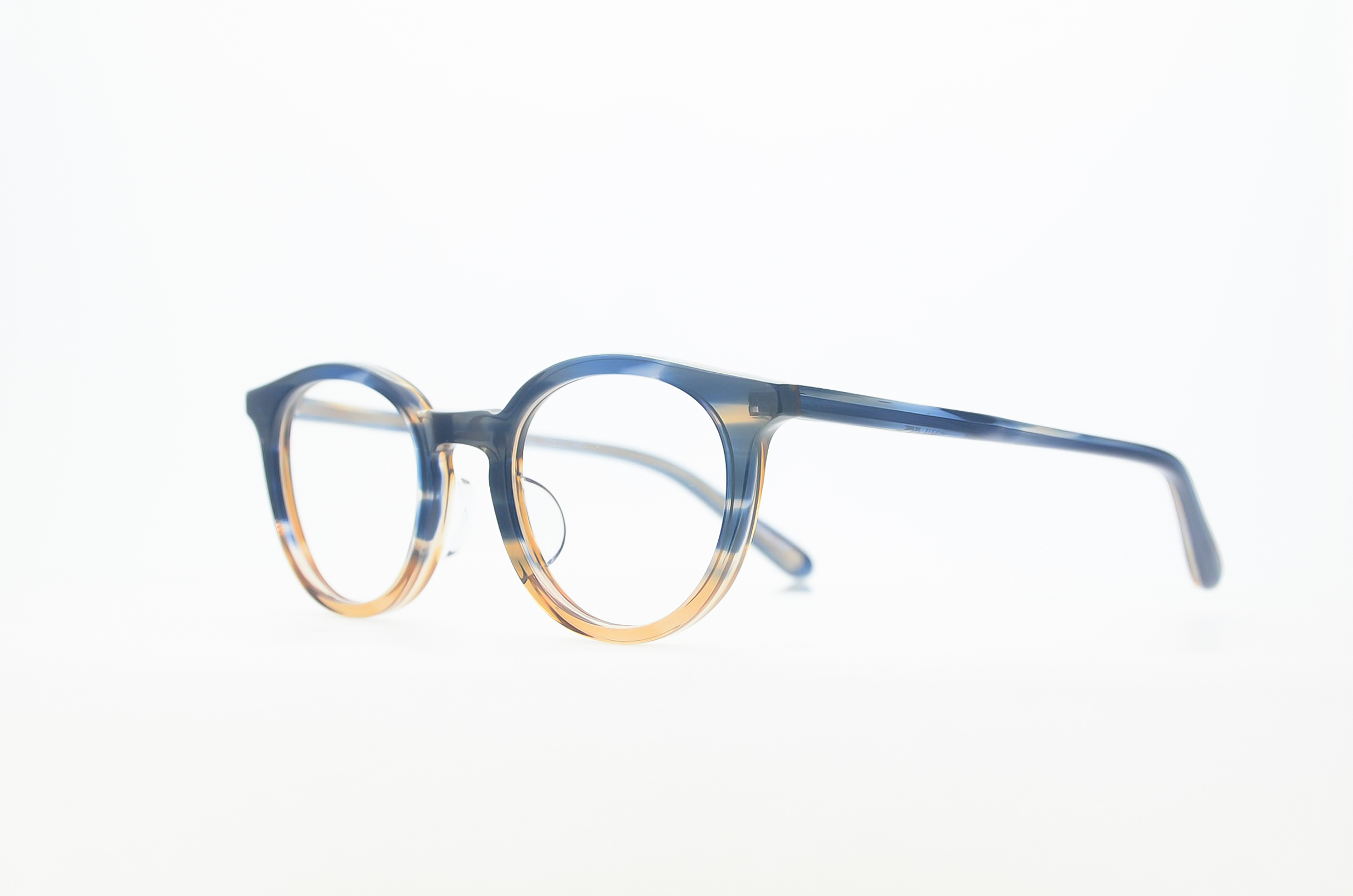 デザイナーのこだわりが詰まった、ヴィンテージライクなデザインがクールなモデル。90年代を彷彿させるウェリントン系シェイプを現代的解釈に、天地が狭いディテールもクラシカル。ハンガーテンプルと名付けたオリジナルのテンプルは、先端がフレームの中で最も重くなるよう芯金の太さを工夫した。この重量バランスで、フレームが前にずれるストレスを軽減。かけ心地の良さも計算された構造は、こめかみに当たる部分は圧を逃し、耳に掛かる部分はしっかり安定する独自開発の設計。